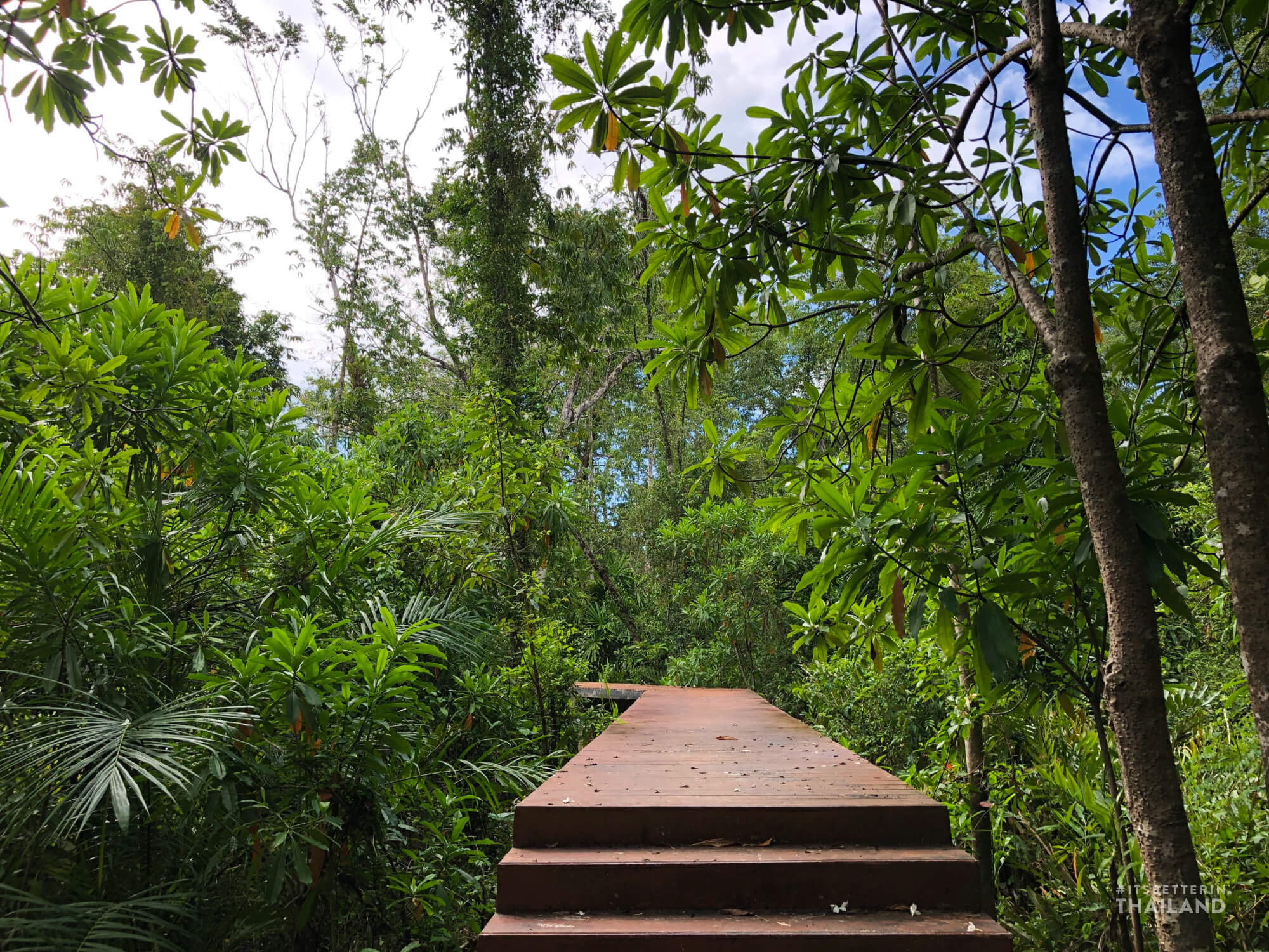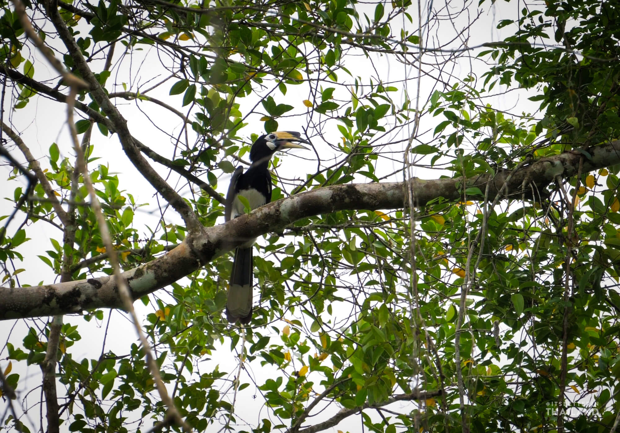 After kayaking, we also walked the 200-meter elevated walkway through the trees which we’d recommend doing if you have time. Out there we saw a pair of oriental pied hornbills. You’ll see in the photo below that they are very cool birds. The walkway is just beyond the stairs that lead down to the boat launch.